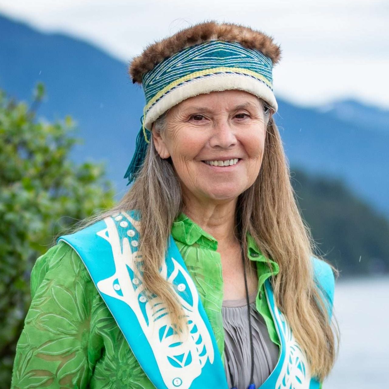 Karen is Tlingit – Raven/Coho – L’uknax.adi (Daginaa Hit), Tsimshian, and Panabscot and her Tlingit name is GunnaShaa.