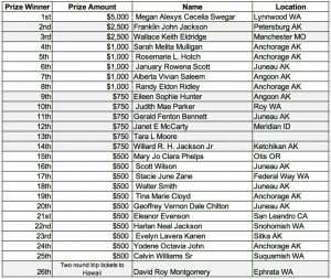 The Independent Inspectors of Election and Voting randomly selected the winners below from among all voting shareholders, who returned a proxy for the 2018 annual meeting. The winners will be contacted by Sealaska. Thank you for voting early everyone. Congratulations to all!