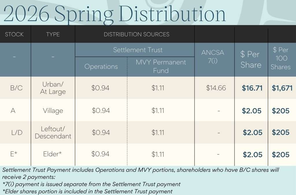 Aak’w Kwáan (Juneau, Alaska) — The Sealaska Board of Directors met this Friday and approved the amount for Sealaska’s upcoming distribution. A spring 2026 distribution totaling $29.7 million will be issued to shareholders on Thursday, April 16.
