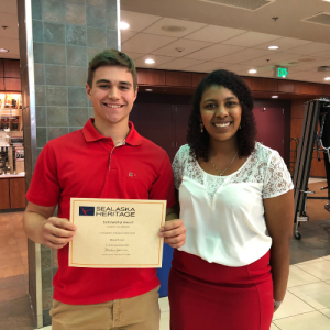 Nicole George, previous Board Youth Advisor, presented Michael Cesar with a scholarship for the 2018-19 school year at Juneau-Douglas High School last year. More than 350 students are receiving a scholarship from Sealaska this year.