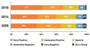 Overall positive feelings jumped 10 points from 2014 (70% vs. 60%) and “very positive” ratings jumped 6 points from 2008 (41% vs. 35%).